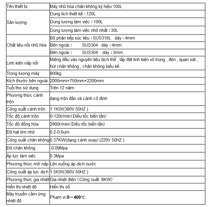 Nồi nhủ hóa chân không : Nồi được chế tạo 3 tầng . Bên trong nồi dày 4 mm , ở giữa nồi dày 4 mm , bên ngoài dày 3 mm , đặc biệt được xử lý đánh bóng cao . Máy sử dụng trên máy đồng hóa , dựa trên cơ bản của sản phẩm không đồng đều mà ấn định thiết lập thời gian đồng hóa , điện áp 380V ,Công suất 3kw , motor điện simen của Đức , Tốc độ vòng xoay chuyển động rất cao 2900 vòng / phút . Máy đồng hóa sử dụng kỹ thuật chế tạo tiên tiến của Đức , kết cấu độc lập , nguyên vật liệu ở nhiều tầng xoay chuyển động và ấn định thời gian ở giữa khoảng cách bên trong xoay chuyển động tốc độ cao . Hình thành line cường độ cao của dao cắt lực dịch thể , phân loại nguyên liệu , đồng thời sản xuất li tâm đùn áp , nghiền , dập ... tông hợp làm lực dùng , cuối cùng sử dụng nguyên liệu tồng hợp trộn , cánh khoáy , độ mịn nhũ hóa đạt đến yêu cầu lý tưởng , nắp nồi có lỗ trống dùng để quan sát , đồng thời trông nồi có cánh tay xem tình hình sản phẩm nhũ hóa , thao tác đơn giản , thông qua đường ốngcó thể trực tiếp và máy chiết tiến hành phân đóng gói , đồng thời có thể đảo nghiêng vật liệu , thuận tiện làm sạch .